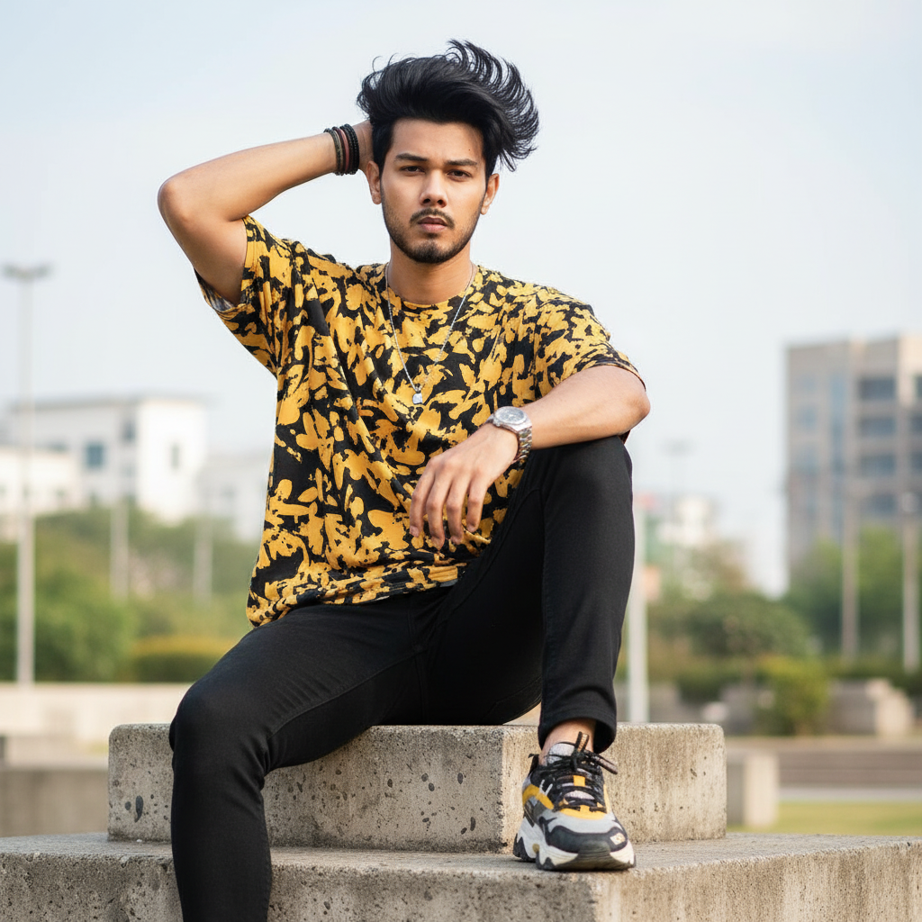 Create image. Trendy young man (use refrence image) sitting casually on a large concrete pedestal outdoors, striking a confident pose with one arm raised and the other resting on his lap. His hairstyle is messy, voluminous, and swept to one side. He wears a loose yellow and black print oversized T-shirt, slim-fit black jeans, and chunky print sneakers. Accessories include a wristwatch, pendant necklace, and bracelets. same face my image upload.