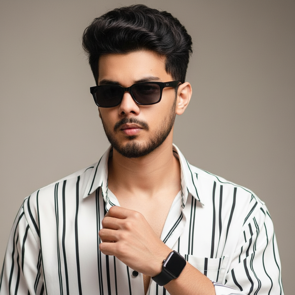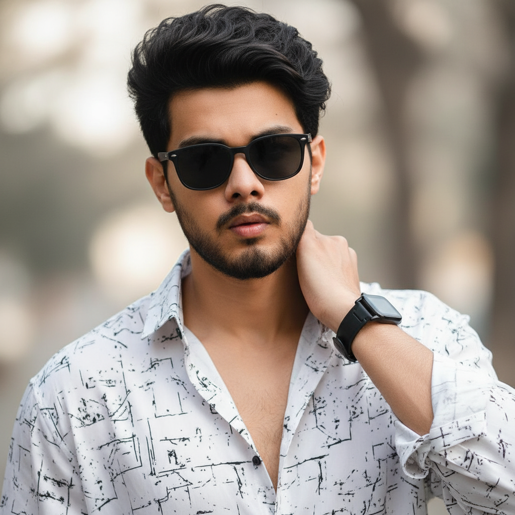 Without changing my focial features. creale a stylish modern portrait of a young man with voluminous wauy dark hair wearing a loose- poly blend white and black shirt Top button down singl accessorieed with a watch. The background is soft, minimal. and sublly blurred to emphasize a contemporary fashion-forward vifoc black sunglasses Cinematic lighting. ultra-detoailed realistic textures and a polished editorial aesthetic same foce my image uplood.. (uploaded photo 100%).