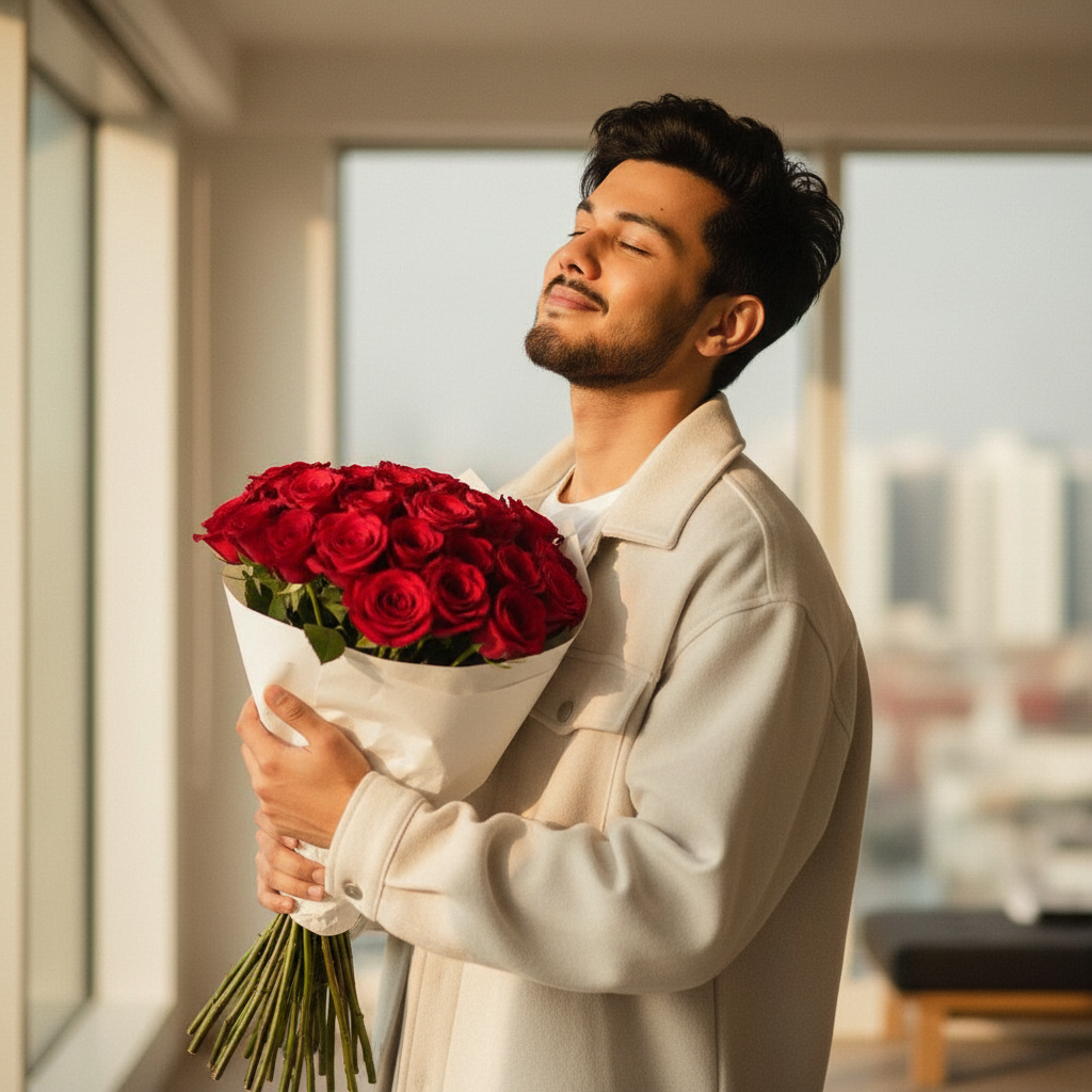 Create A candid, heartwarming portrait of a young man standing in a modern indoor setting, holding a bouquet of fresh red roses wrapped in white paper. He has messy, softly hair and wears a cozy light-colored oversized jacket. Her expression is joyful and serene as she smiles with her eyes closed, tilting her head slightly in a moment of bliss. The ambient lighting gives the scene a warm, cinematic tone with gentle highlights on her face and hair.