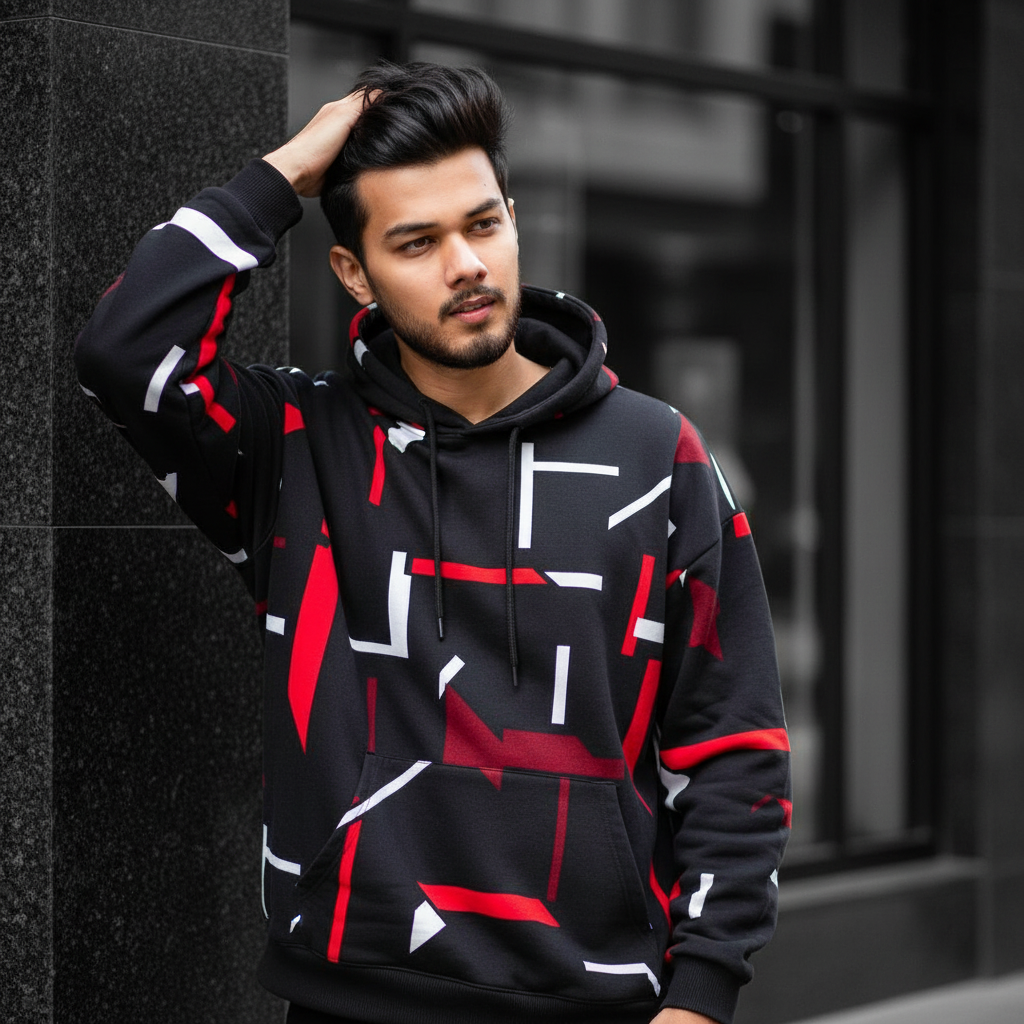 A vibrant, high-fashion portrait of a young man [keep it real face from uploaded image ] Voluminous hair, He is posing one hand in hair against a dark pillar, looking front side with smile and to the side with a pensive and cool expression. His outfit is a black oversized hoddi in shades of white, black and red. The background is blurred, showing a building with dark tones, possibly a shop or cafe, under bright with my original face 100%.