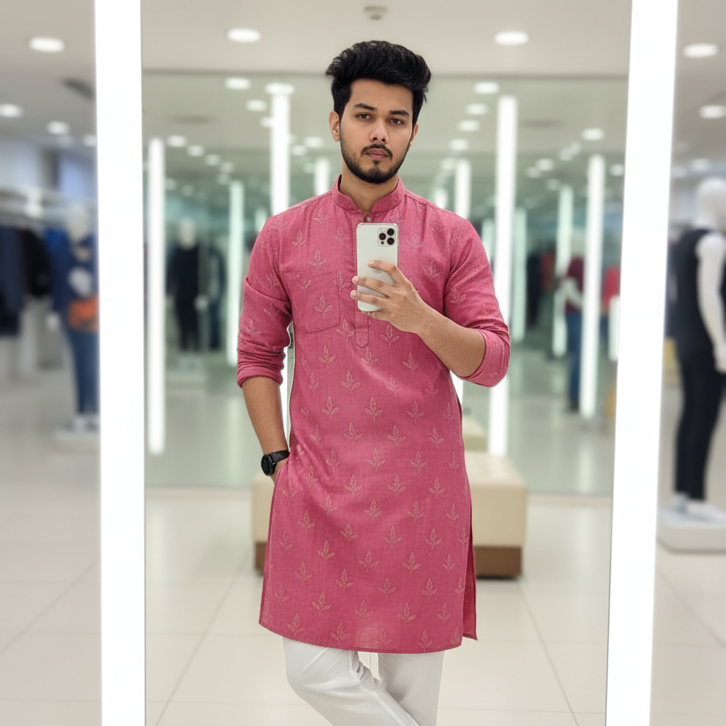 Create Stylish young slimfit man (face like 100% upload image), with dark, messy hair and, leaning casually against a showroom mirror. He is wearing a raspberry pink leaf pattern kurta white pajama Right hand holding a iPhone 15 white colour left hand in pocket looking directly at the mirror camera. He has a dark watch on his left wrist. Lighting is bright and even highlighting.