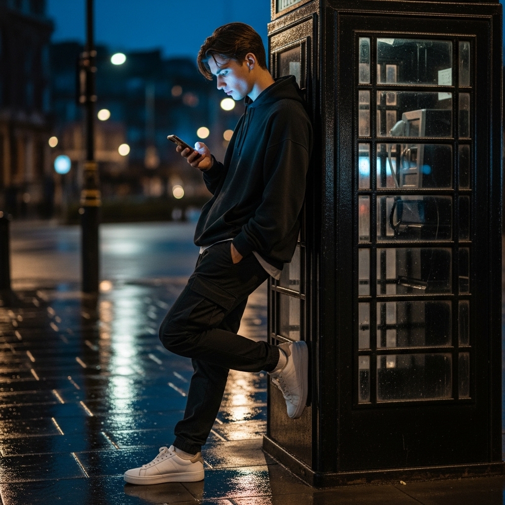 “A dynamic full-body shot of a young man in his late teens to early twenties with a lean build, casually leaning against a classic black British telephone booth at night. He is fully absorbed in his phone, which emits a soft blue glow illuminating his face. He wears a dark, slightly oversized hoodie, black cargo pants, and clean white sneakers. His dark hair is styled in a relaxed, modern fashion. The scene is set on a wet city street, with reflections shimmering on the ground. Soft ambient lights from distant street lamps and blurred car headlights create a cinematic bokeh in the background. High-detail, ultra-realistic, moody night atmosphere, volumetric lighting, full-body portrait, photography style.