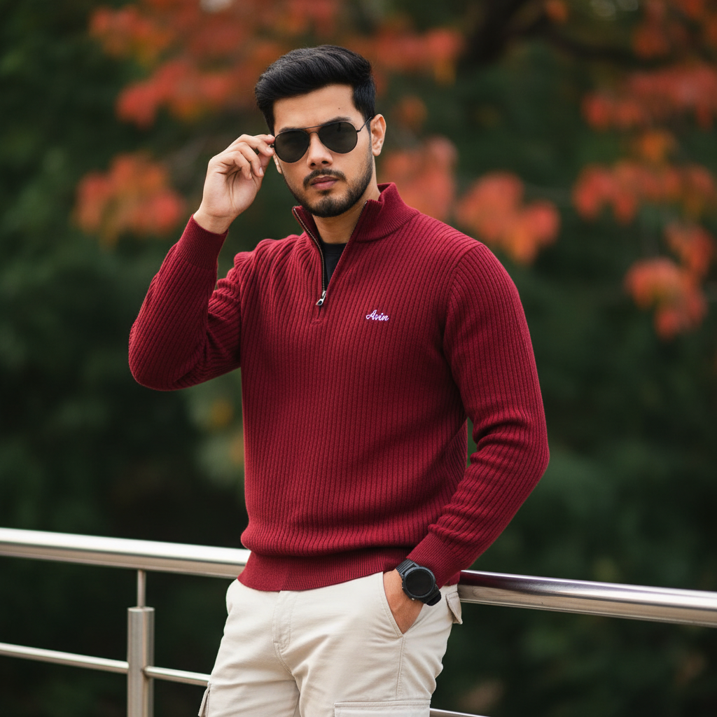 “A hyper-realistic portrait of a stylish 22-year-old man resembling the uploaded photo, wearing a ribbed deep-red quarter-zip sweater with a small embroidered ‘Avin’ logo on the chest and light-colored cargo pants. He stands outdoors, leaning casually against a sleek metal railing. One hand adjusts his dark sunglasses while the other rests in his pocket, subtly revealing a round smartwatch. The background features soft, dark greenery with hints of warm red-orange foliage. Captured in natural daylight with professional, high-quality photography lighting — ultra-detailed textures, realistic skin tones, and cinematic depth of field.”