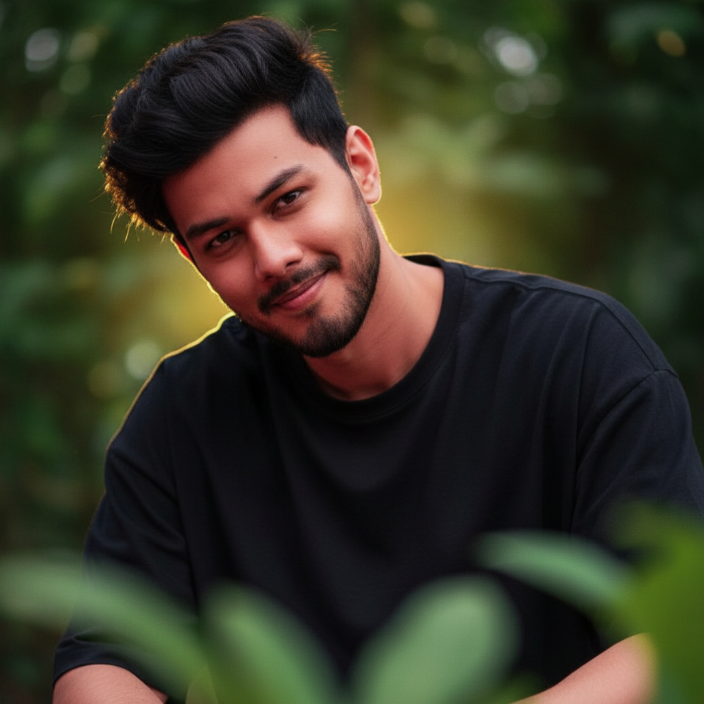 hyper-realistic dark Red portrait cinematic image with smaile actions. (uploaded photo 100% face match) of a very handsome young man (followed by given picture face) Soft moody cinematic lighting highlights his facial features naturally. He leans casually pose, wearing oversized black t shirt, hair style volume, well-fitted complement the serene, earthy setting. The background backlight yellow on head features deeply blurred lush green foliage with foreground leaves softly