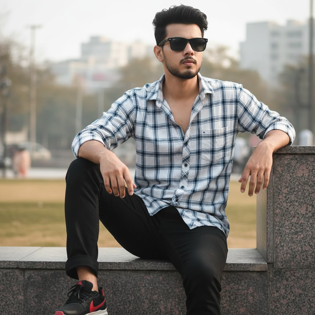 Use this face and create stylish young man with dark, styled hair and a beard, wearing sunglasses, a white and dark blue plaid shirt with the top buttons open, and black pants. He is also wearing black and red sneakers. He sits casually on a dark stone bench or ledge outdoors, with a blurred background suggesting a park or urban setting with sunlight.
