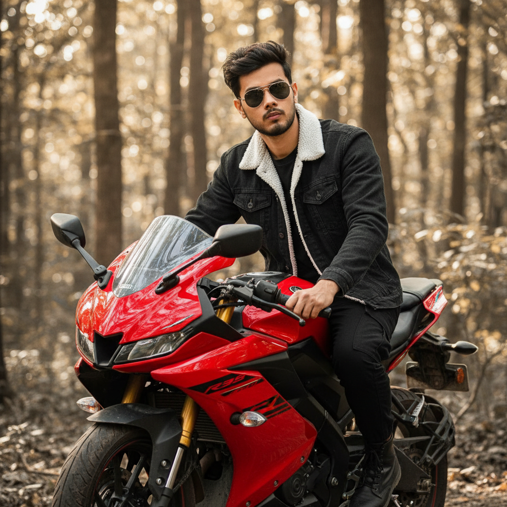 8K ultra-realistic close-up cinematic portrait of a young man (exact same face as reference) with messy hair and dark stylish sunglasses, seated on a red Yamaha R15 in a lush sunlit forest. He wears a stylish denim fur jacket and black cargo pants. Captured from a front-side angle. The background is unsaturated(black & white), emphasizing the subject and bike.