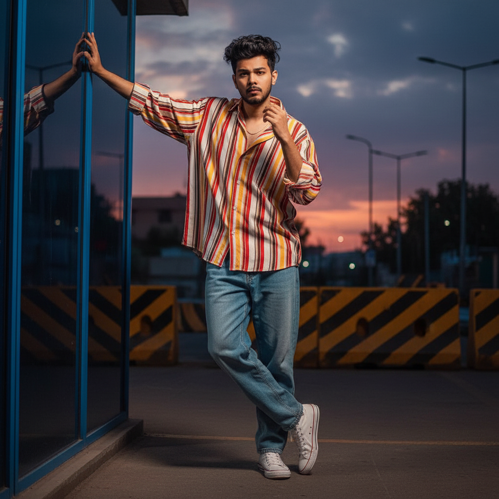 Create a stylish young man (use refrence image)age_19with messy, volume hair strikes a dynamic pose outdoors at dusk, leaning with one hand on a blue-framed glass window and the other hand resting near his face. He is wearing a red white yallow lose shirt with the sleeves rolled up and light blue buggy pants, paired with white high-top sneakers. The background features an urban street with bold yellow-black striped barriers and a dramatic evening sky, giving the image a moody.