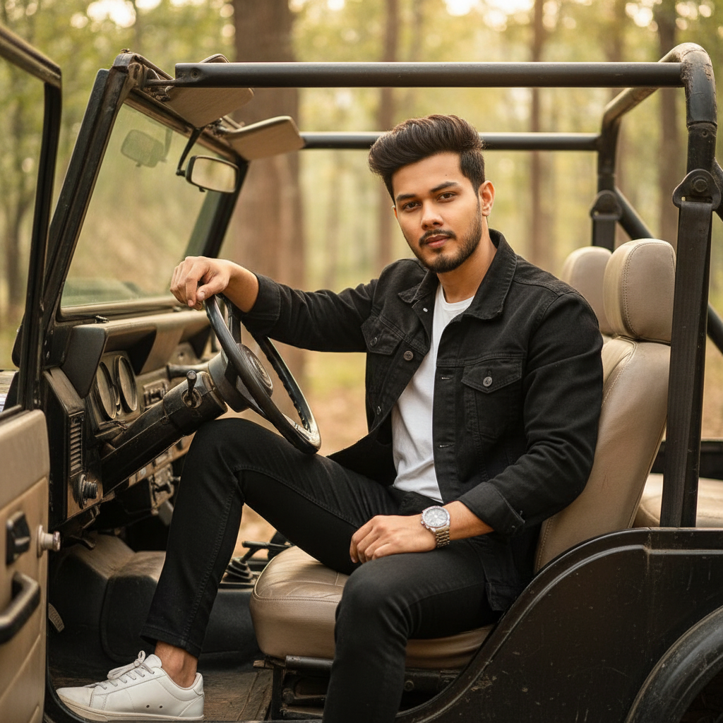 A stylish young man with trendy hair and "A stylish young man with trendy hair and, wearing a black denim jacket over a light t-shirt, black pants, and white sneakers, sitting casually in the driver's seat of a rugged, open-top jeep. He is looking directly at the camera with a confident expression. The background is softly blurred with green foliage, suggesting an outdoor, natural setting.