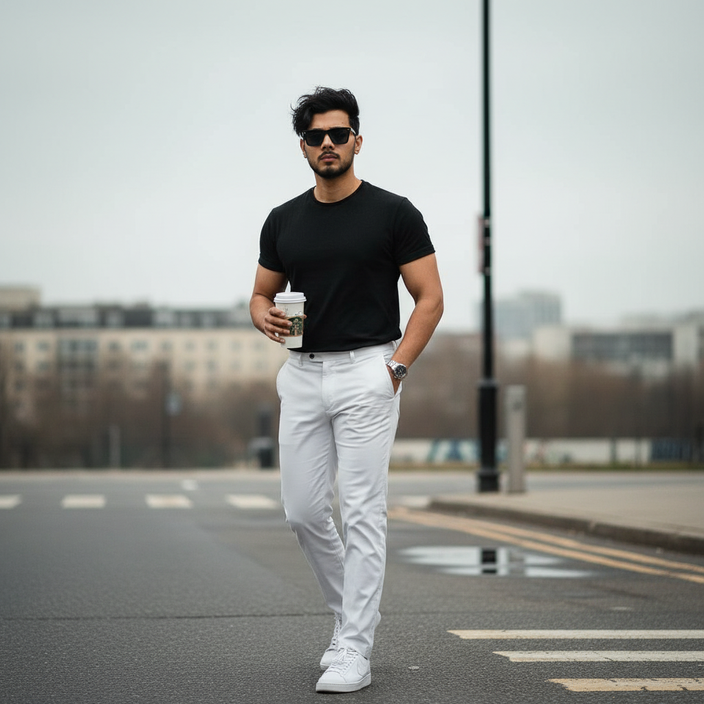 Hyperrealistic 8k ultra-detailed portrait (use my image for accurate face 100%), cinematic photography of a stylish fit man crossing the street, a light post in background. He has messy, hair over his eyes and is wearing square sunglasses, a half sleev black tshirt with rolled-up sleeves, tucked into white chinos, and white Nike sneakers. His left hand is in his pocket, a Patek Philippe watch is on his wrist, and he holds a Starbucks coffee in his right hand. Dull, muted lighting.