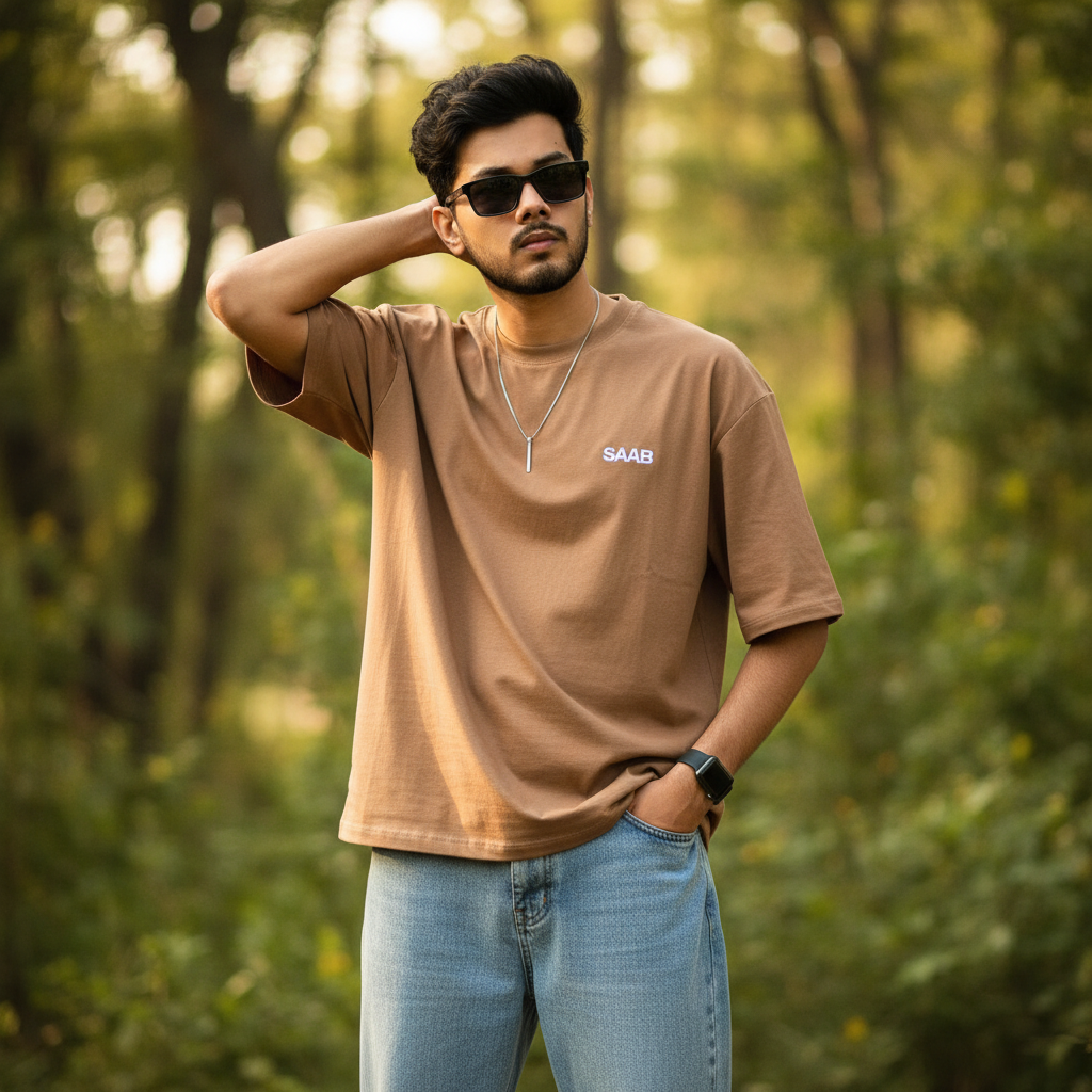 create image. A stylish young man with messy volume hair, posing outdoors in a vibrant natural setting. He's wearing an oversized light brown T-shirt withand a 'SAAB' logo, buggy jeans, rimless rectangular black sunglasses, a vertical bar pendant, and a black Apple Watch. The background is lush, softly blurred greenery with cinematic lighting, creating an ultra-realistic 8K DSLR-quality image.