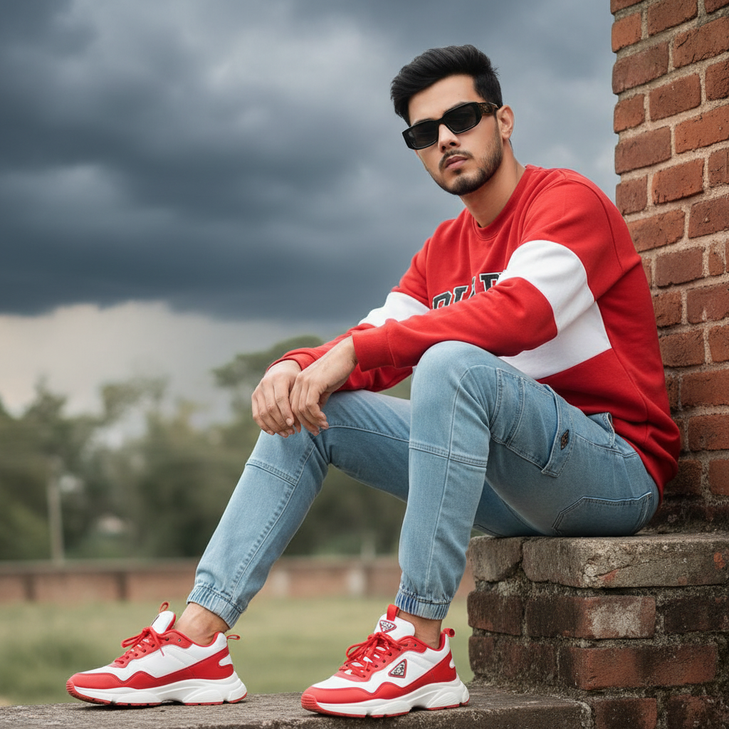 Use this face and create ultra realistic 8k resolution Portrait full-body shot of a young man with fair skin and dark hair, dressed in casual attire, sitting on a ledge. He's Wearing Red White sweet shirt with light blue cargo jogger jeans and red and white chunky sneakers and black Prada sunglasses with a somewhat serious or contemplative expression. The background shows a bright dark cloudy weather and some blurred Greenry and trees, including a brick wall to his right.