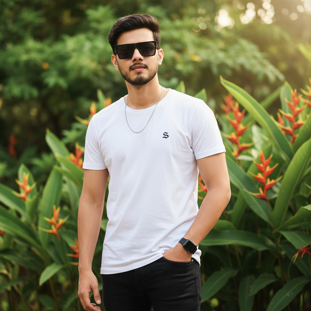 Create a 4k cinematic half-body portrait of a young man, with dark hair slightly bent forward toward the forehead. He has detailed eyes, lips, and a calm, confident expression. He wearing a white t-shirt S name logo, black jeans, black sunglasses, a minimal silver chain, and a smartwatch on his wrist. Stands casually with one hand in his pocket, surrounded by lush green tropical plants and red-orange flowers. The setting features soft warm sunlight, Keep my face 100% reference images.