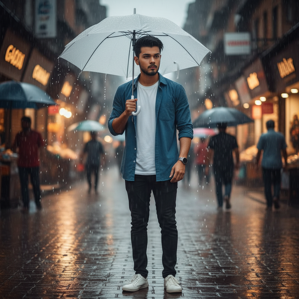 4K ultra-realistic cinematic full-body portrait of a handsome young man (100% same face and hairstyle as in the uploaded image) standing in a rainy market street. He holds a white umbrella as gentle rain falls from the sky, creating wet reflections on the ground. He wears a blue shirt over a white T-shirt, black pants, and white sneakers. A smartwatch shines subtly on his wrist. The market around him is softly blurred (bokeh style) — colorful shops, glowing signboards, and people in the background add a warm urban vibe. Raindrops glisten on his umbrella and shoulders, his hair slightly damp, giving a natural cinematic realism. Lighting is soft and moody, with streetlight reflections enhancing the rainy evening atmosphere. Emotional, elegant, and visually stunning 4K ultra-HD cinematic portrait.