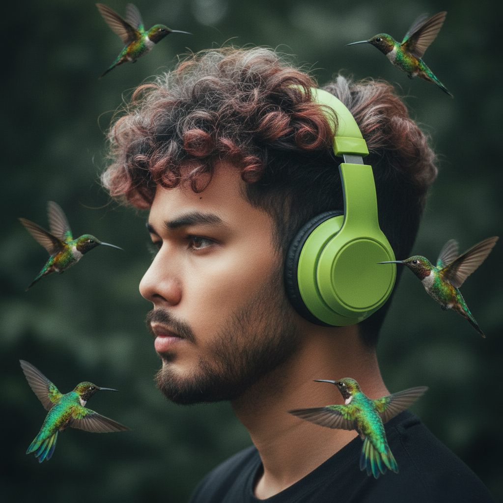 He is wearing lime green over-ear headphones, a fusion of modern tech and nature.