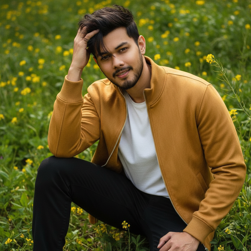 An 8K hyper-realistic fashion editorial portrait of a man whose face exactly matches the uploaded photo (100% identical), smiling naturally. He is leaning slightly forward on one knee in a relaxed, dynamic pose. One hand rests casually on his thigh while the other gently brushes through his slightly messy hair falling over one eye. Captured from a low-angle camera shot tilted slightly upward, creating a cinematic, dramatic perspective. The scene is set outdoors amid lush green foliage and blooming yellow wildflowers, with soft natural sunlight filtering through. Rendered in ultra-realistic detail with perfect skin texture, realistic lighting, and professional fashion editorial composition.