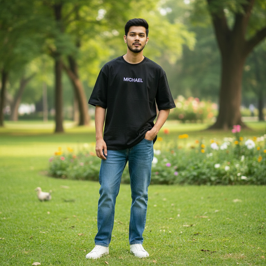 Ultra realistic 16K portrait of a young man, exact face and hair as in reference image, standing in a casual pose in a lush green park or garden, natural daylight, soft shadows. Wearing a black oversize t-shirt with embroidery MICHAEL as a logo on it, buggy blue jeans, white sneakers. One hand in pocket, relaxed look, subtle smile, clean modern hairstyle. Background features grass, trees, and a few blurred flowers, creating a calm, natural vibe. Use the attached reference image for accurate face details.
