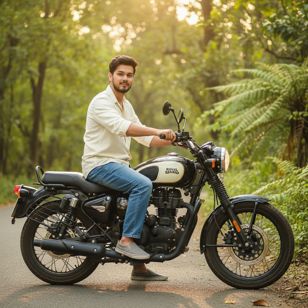 A full-body outdoor shot of a 25-year young man with dark, wavy hair and a beard, wearing a light-colored long-sleeved shirt and loose-fitting jeans, with gray slip-on shoes. on a black and cream colour royal enfield hunter 350 bike, looking towards the camera with a relaxed expression. The background features lush green trees and foliage, suggesting a sunny day.