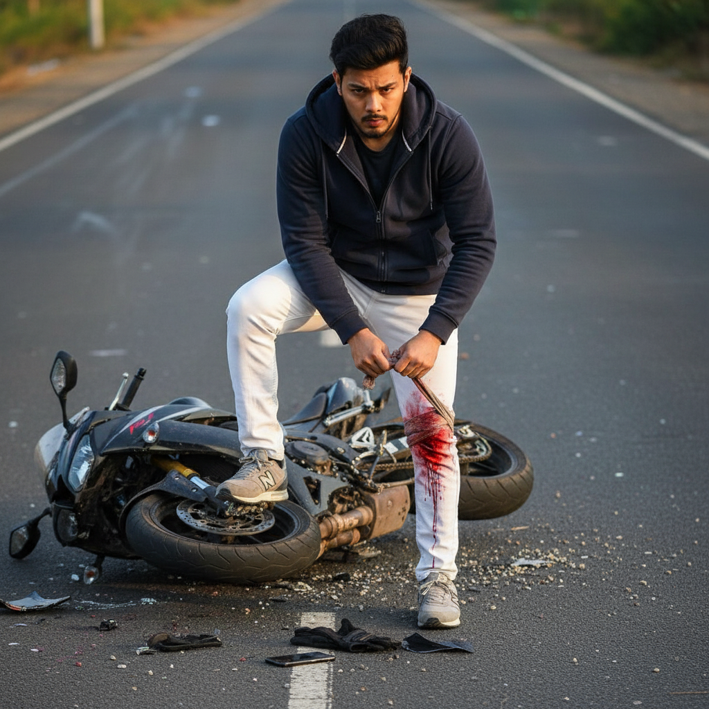 A man was injured in a bike accident on the road. The man is keeping his left leg on the bike and tying a cloth around his knee. Blood is coming out of his knee. He is wearing a hooded jacket and white 'bolbetam' jeans, grey New Balance shoes. The image should be captured with an iPhone 1080 quality camera and the face should be 100% visible.