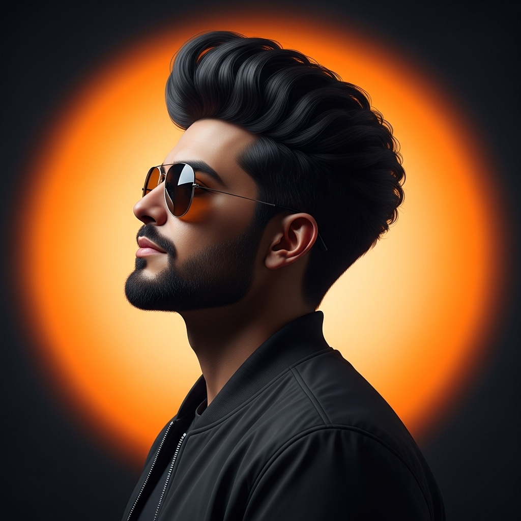 Ultra-realistic cinematic portrait of uploaded man in profile view, wearing a plain black jacket and aviator sunglasses. He has thick, voluminous, well-styled black hair and a neatly trimmed beard. His head is slightly tilted upward, with a calm and confident expression. Lighting setup: dramatic orange spot light glowing behind his over head, creating a radiant circular aura effect, contrasted against a dark background