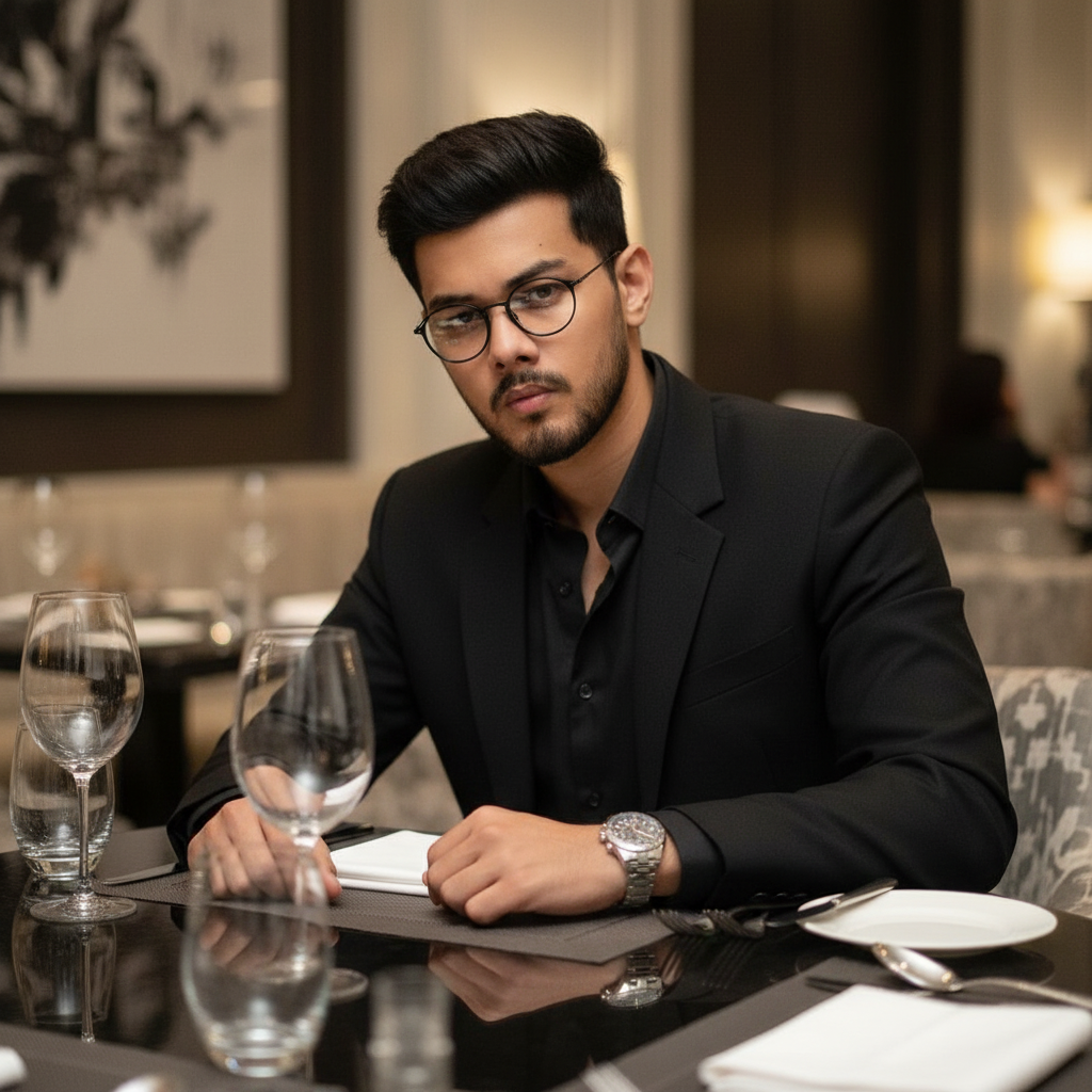 Ultra-realistic portrait of me sitting at a super elegant table I am wearing an all-black suit black shirt ,black round Glasses with a silver watch visible on my wrist.