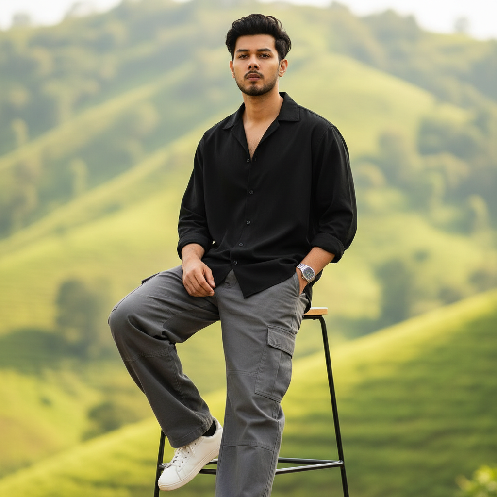 Ultra-realistic DSLR full-body portrait: 22-year-old slim boy (5'10" ft), reference face. Sitting on a modern chair, relaxed pose, hands casual, one in pocket, confident direct gaze. Wearing oversized black open-collar shirt, loose gray cargo trousers, white sneakers, sleek watch. Messy, trendy dark hair, Gen Z influencer vibe. Background: lush green hills, blurred creamy bokeh, natural daylight. High contrast, sharp focus, cinematic photorealistic editorial style