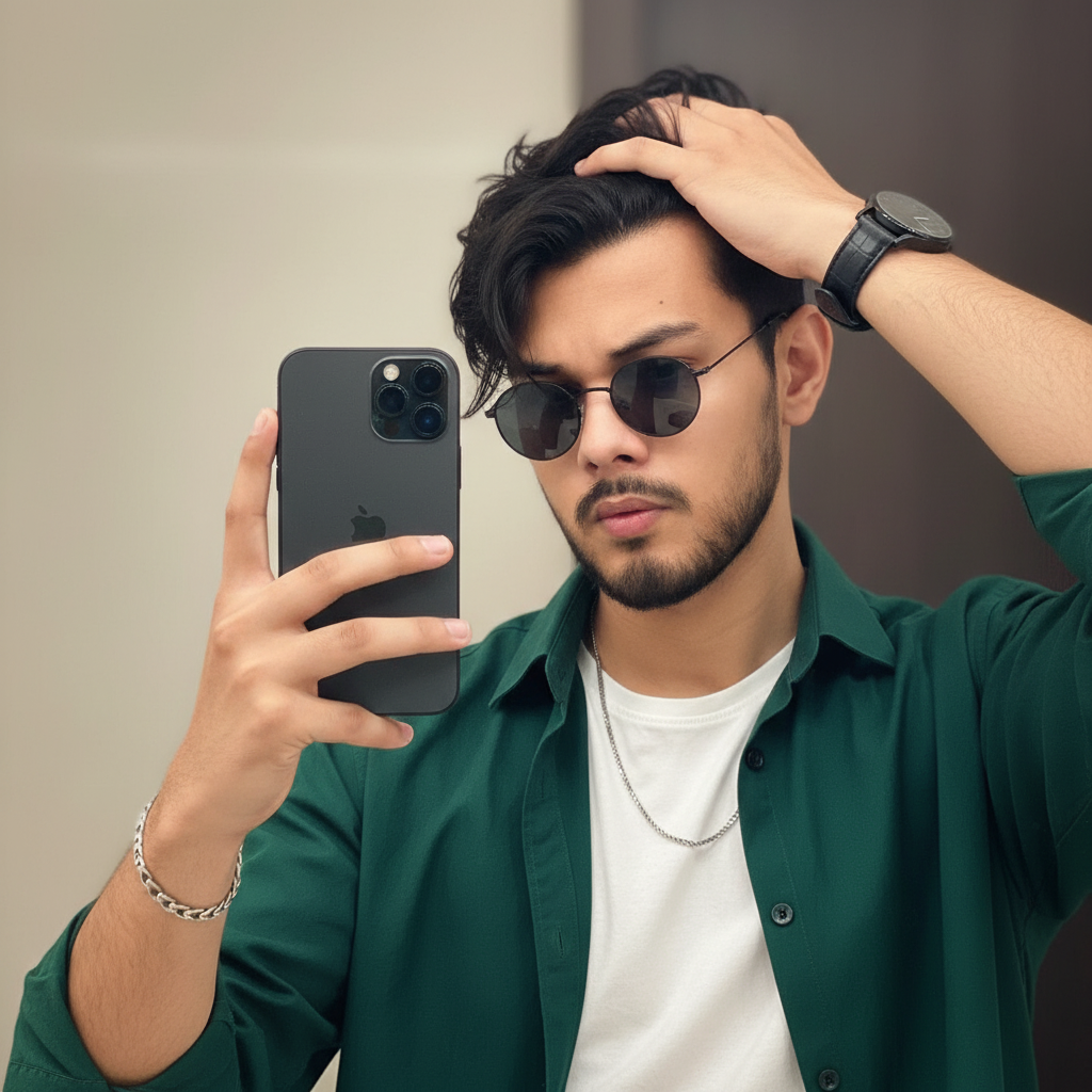 ultra -realistic a selfie young in front of a plain or softly-lit background. Hold phone in iphone 14 Pro one hand so it's visible in the mirror, and use your other hand to run through your hair, showing your wristwatch or bracelet clearly with small sunglasses. Wear a Deep Green and red shirt and a chain necklace, and make sure your face is partially covered by your hand and hair for a casually stylish look. Add any same face match in reference.white shirt lit