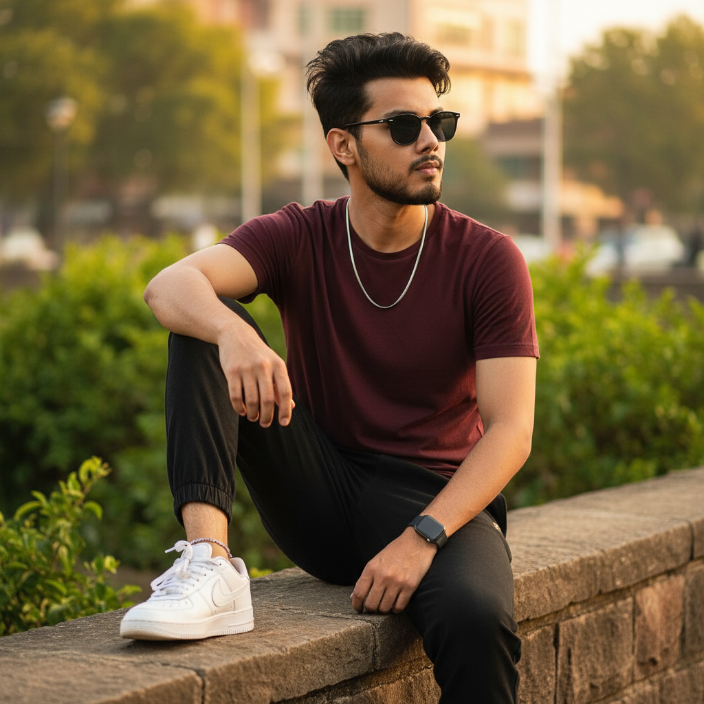 A stylish 22-year-old skinny boy with messy hair and attitude, wearing a mehroon shirt, anklet dark black jogger, and white Nike sneakers.