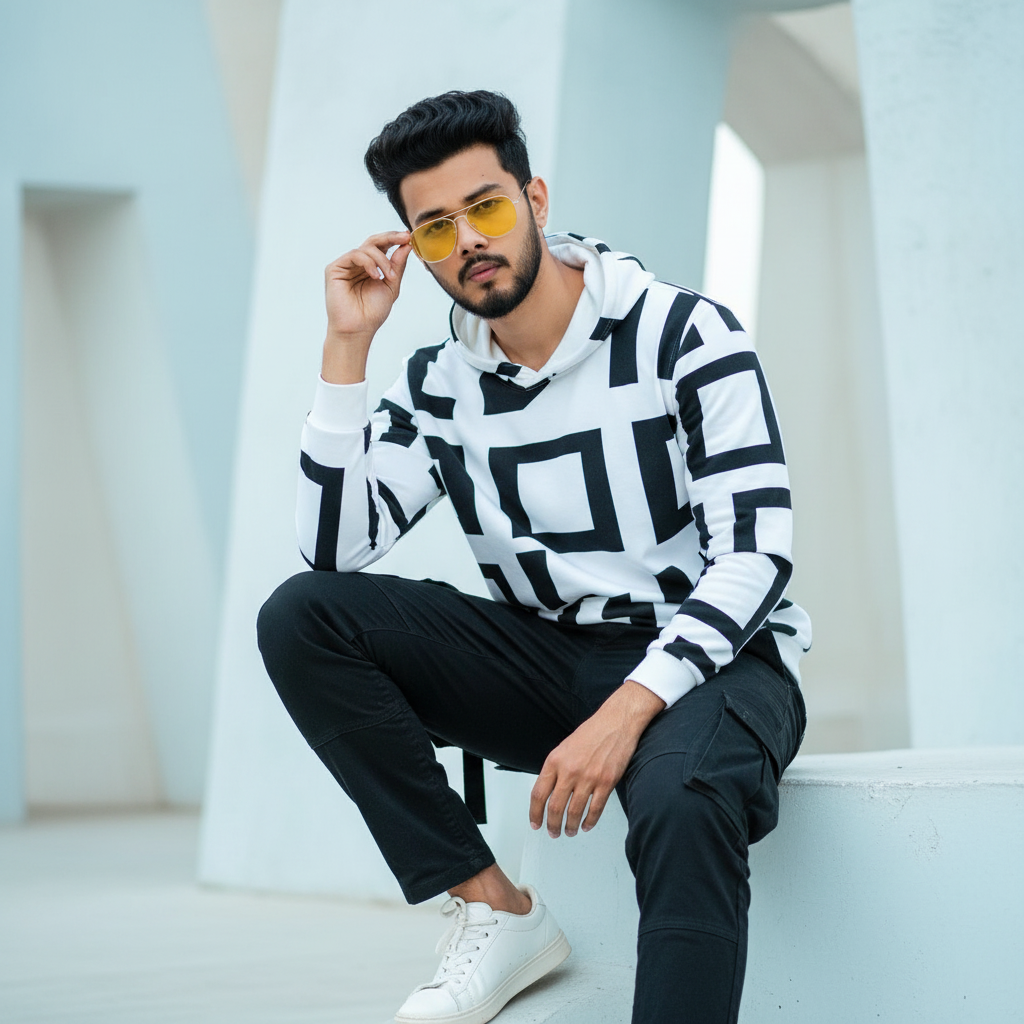 Ultra-realistic 20 stylish young man (refrence image given) with dark hair and a beard is seated in a cool pose. He's wearing a vibrant white black hoodie, open at the collar, paired with black cargo pants. White sneakers complete his casual yet fashionable look. 100% He is so stylish &with a cool poses yellow sunglasses The background consists of abstract, textured white and light blue structures, creating a clean, modern, and slightly. Keep my face 100% same as in the reference image.