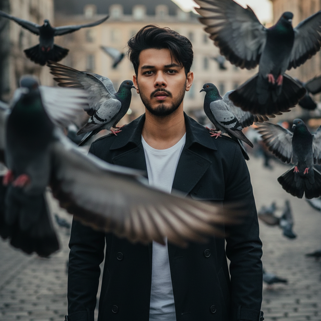 8k Hyper-realistic, A cinematic portrait of a young 25 year old man, his hair is messy over the eye, [keep it real face from uploaded image ] in a long dark trench coat, surrounded by pigeons flying dramatically around him. Some pigeons fly very close to the camera, wings blurred in motion, others perch on his shoulder. His expression is serious and enigmatic, half of his face obscured by a pigeon in the foreground. Moody lighting with strong shadows and highlights