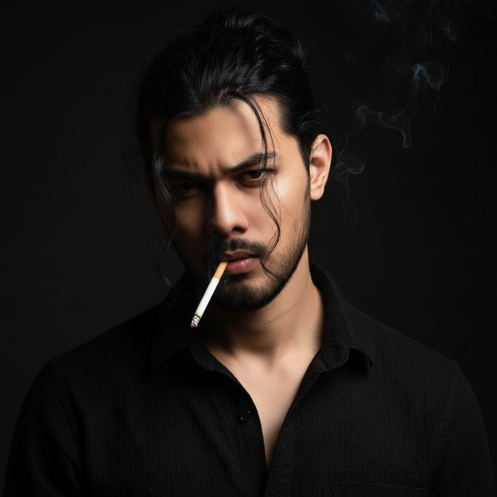 “Dark, moody stylish portrait of a handsome young man with sharp, intense features. He has long black hair tied back in a messy bun, with a few loose strands falling across his face. His piercing eyes and strong eyebrows give a serious, brooding expression. A lit cigarette dangles casually from his lips, glowing faintly in the dim light. He wears a black collared shirt, partly unbuttoned, blending into the dark background.
