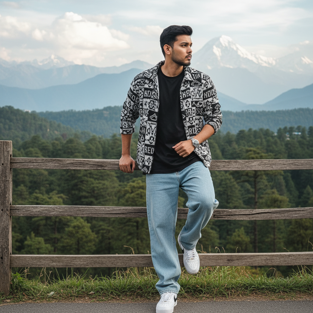A young man in a black and white jacket, oversized black t-shirt, light blue baggy jeans and Nike white sneaker.leaning on a wooden fence, looking directly at the camera. He has subtle and a rolex watch. The background features mountain formations, lush green trees, and the mount Everest under a cloudy sky. The image has a DSLR photography style, with diffused natural light, emphasizing a tranquil, adventurous mood. Ultra realistic. Pose: looking sideward face in attitude pose.looking road.