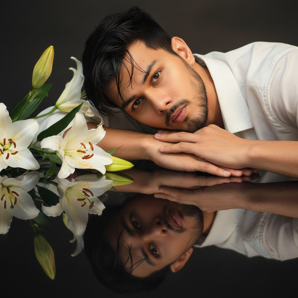 A dreamy, ultra-realistic portrait of a handsome young man lying gracefully beside white lilies, his head resting gently on his arms, reflected perfectly on a glossy black surface. Soft cinematic lighting highlights his glowing skin and sharp yet delicate facial features, with slightly wet strands of hair falling naturally across his forehead. The mood is ethereal, romantic, and artistic, with a serene atmosphere. High detail, professional studio photography, 8K resolution.