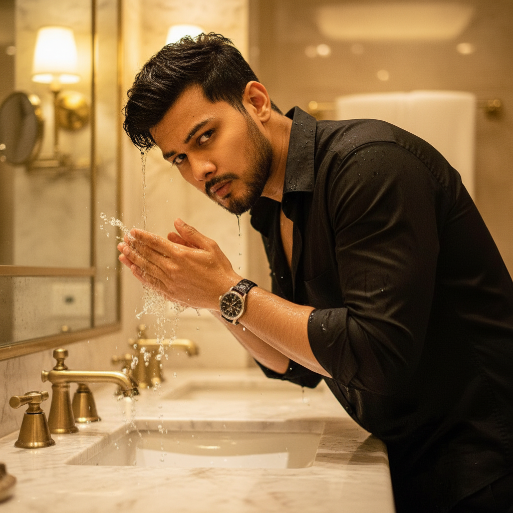 8K focus on face and hair 100% reference as uploaded photo, Cinematic portrait of a stylish young man in a luxurious, Golden-lit bathroom, wearing a black unbaton full shirt, washing his face at a polished basin. He has wet, touch circle watch luxury. Water splashes, and droplets realistically adorn his face and hair. he looks directly at the camera from right side. Warm, sophisticated high-end bathroom with marble surfaces. No sunglass.