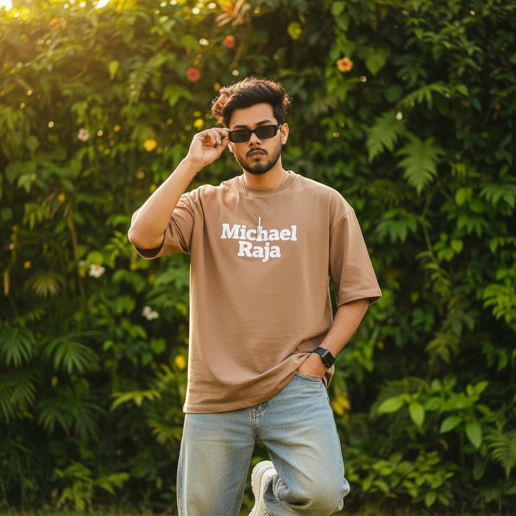 Create image. A stylish young man use my face with messy volume hair, posing outdoors in a vibrant natural setting. He's wearing an oversized light brown T-shirt with and a 'Michael Raja' logo, buggy jeans, rimless rectangular black sunglasses, a vertical bar pendant, and a black Apple Watch. The background is lush, softly blurred greenery with cinematic lighting, creating an ultra-realistic 8K DSLR-quality image