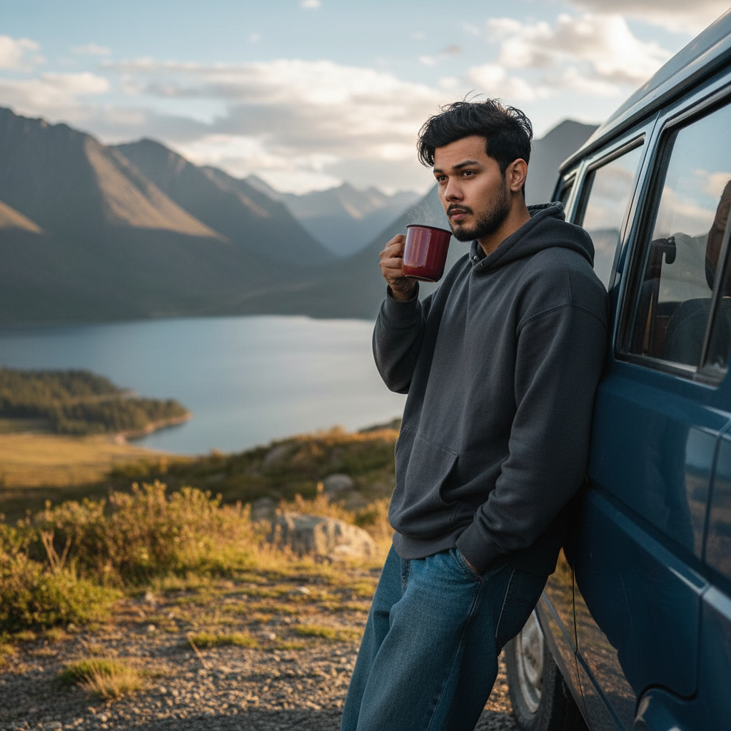 Medium shot, half-body. (Face 100% same uploaded image) A 22 year old young male standing outdoors in a mountainous, lakeside landscape, leaning casually against a dark blue, older model van or camper, with a lean build, fair skin tone, messy black hair. His expression is somewhat neutral or contemplative. He is dressed in a dark gray, oversized hoodie and loose-fitting, dark blue or denim-colored pants. He holds a dark red mug in his right hand, suggesting he is drinking a warm beverage.
