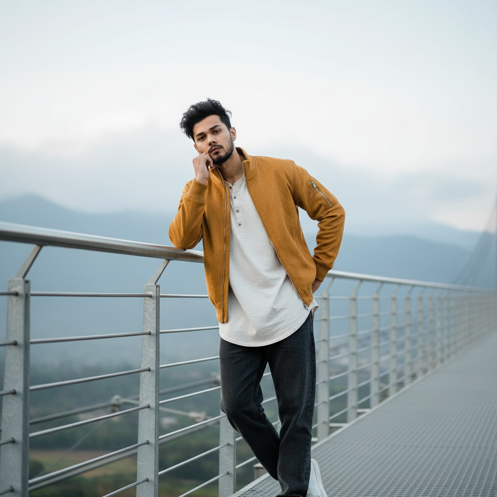 Create image A stylish young man(use refrence image) with messy, voluminous hair, standing in a relaxed pose on an airy metal bridge. He is wearing dark buggy jeans, a loose-fitting light-colored shirt layered with an open, and white sneakers. His body leans back against the railing, one hand gently touching his face, the other resting on his hip. The background is softly blurred with a misty sky and distant landscape, creating a natural, cinematic vibe and modern stylish look.