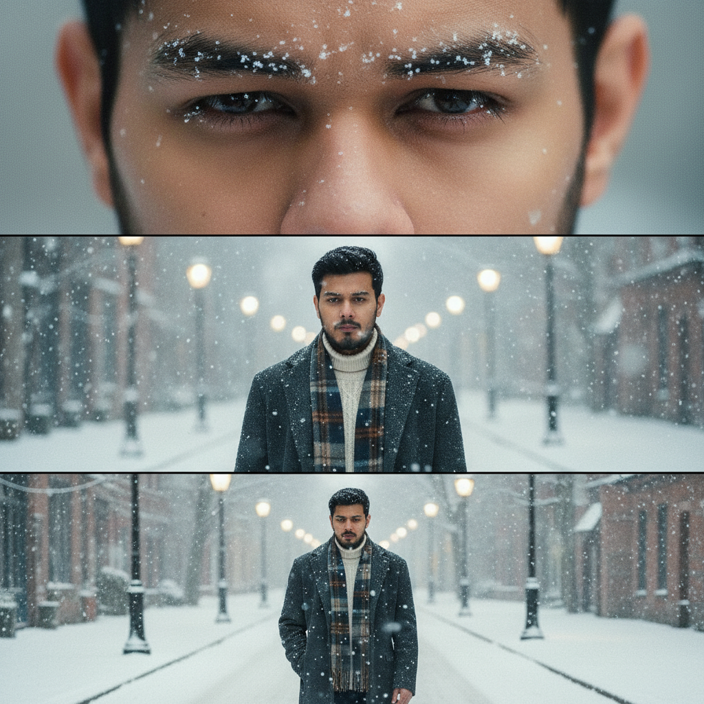 Middle frame (medium shot): the man standing in falling snow, wearing a cozy winter coat and scarf, his breath visible in the chilly air. His expression is serene, introspective, and cinematic.