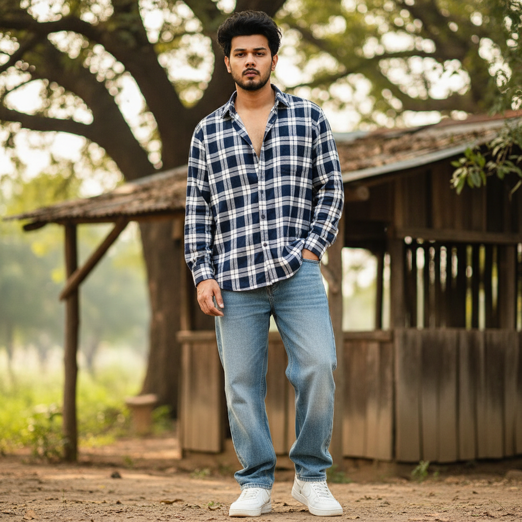 Ultra-realistic 8K full-body male portrait, standing outdoors in front of a rustic wooden shelter, natural daylight. Outfit: navy and white checked loose-fitting shirt, baggy light blue jeans, sporty white sneakers. Pose: standing casually with arms relaxed by the sides or hands loosely in pockets, confident expression, messy voluminous black hair with a slight natural wave. Background: outdoor rural setting with trees, greenery, and subtle cinematic bokeh, lifelike colors and soft shadows.