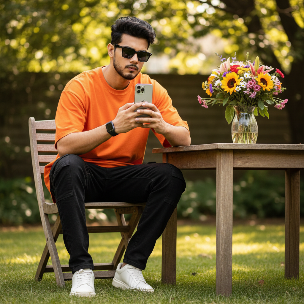 “Cinematic, hyper-realistic full-body portrait of a stylish young Indian boy, exact face from uploaded reference, wearing orange oversized orange shirt, black cargo jeans, white shoes, tousled hair, black sunglasses, black smartwatch, holding an iPhone 16 seating in garden table with comfort. Flower bouquet beside him. Leaning forward with elbows on knees, phone close to face, intense yet stylish focus, confident posture, cinematic framing.”