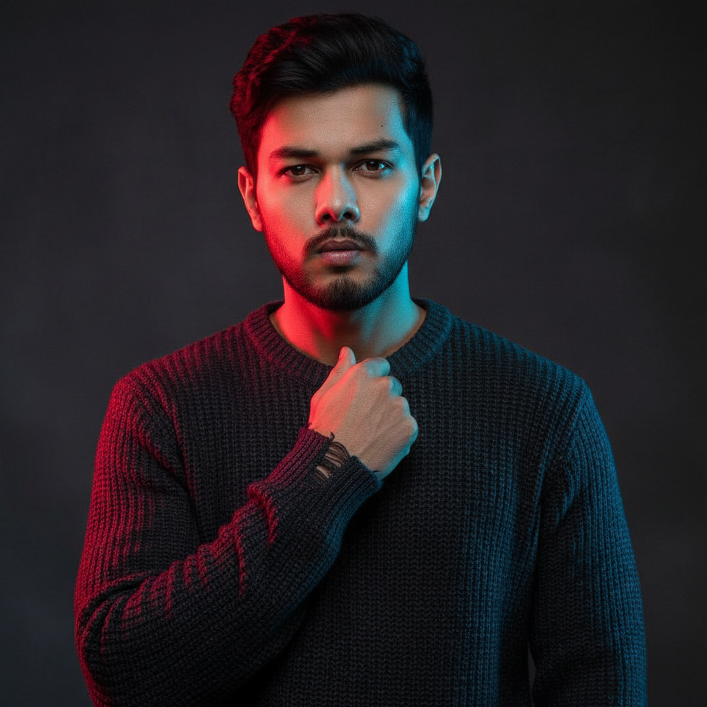 A man with sharp, well-defined facial features resembling the uploaded photo stands in a moody, dramatic photoshoot setting. He wears a knitted sweater with slight tears at the wrists, lifting the collar just slightly but without covering his face or placing any hand near it. His expressive eyes and intense gaze remain fully visible. The scene is illuminated with cinematic dual-tone neon red and blue lighting, creating a deep, high-contrast, atmospheric look against a dark, minimal background. Captured in an ultra-detailed, hyper-realistic style with soft shadows and professional studio quality lighting, evoking a sense of mystery and sophistication.