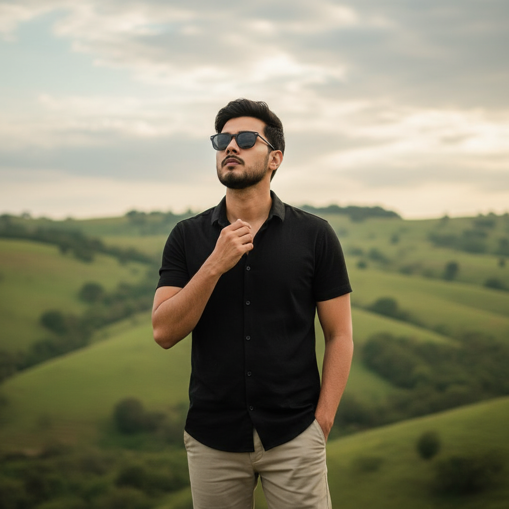 A stylish man with dark hair and sunglasses, wearing a black short-sleeved button-up shirt and light-colored pants, stands outdoors. He is looking upwards with a contemplative expression. The background features rolling green hills under a cloudy sky. The lighting is natural, highlighting the textures of his clothing and the landscape. The photo should capture a serene and slightly dramatic mood, similar to the provided image.