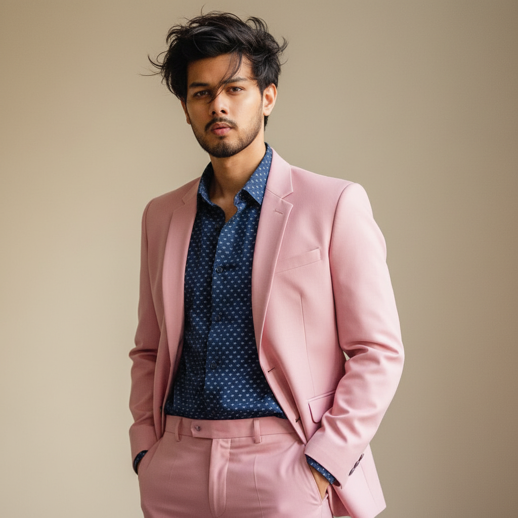 A Ultra-realistic, cinematic 8K close up half body portrait of a young handsome man (exact same face from reference) height, standing casually with one hand in pocket. He wears a Navy White Shirt, Pink Formal Trouser pant Pink jekit, His hair is wind swept-voluminous with subtle grey highlights, tousled naturally with a few strands falling, The background is soft, minimal, and subtly blurred to emphasize a contemporary fashion.