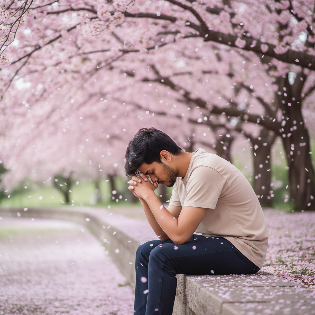 A solitary teenage man (around 19 years old) with dark, slightly messy hair, wearing a simple beige t-shirt and dark trousers. He is sitting with his head bowed and chin resting on his hands atop a smooth, pale stone wall, conveying a sense of melancholy. The entire scene is bathed in the soft, natural light of a vibrant cherry blossom forest (Sakura) in full, stunning bloom. Thousands of delicate pink petals are floating in the air and scattered thickly across the ground. 8K resolution