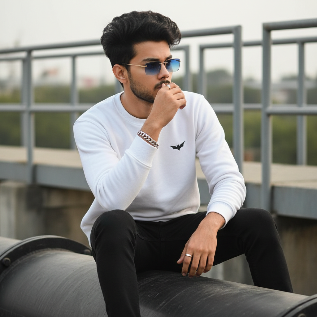 A stylish young man with 100% same face as is refrence, voluminous, naturally tousled hair, relaxing in a laid-back pose on a large black cylindrical object outdoors. Wearing a white Sweatshirt a small bat logo on it, and black pants, and a rimless rectangular Gradient Blue Sunglasses golden framing, accessorized with a silver bracelet and rings. The background includes industrial railings and blurred outdoor elements, His face is turned sideways and partially obscured by his hand