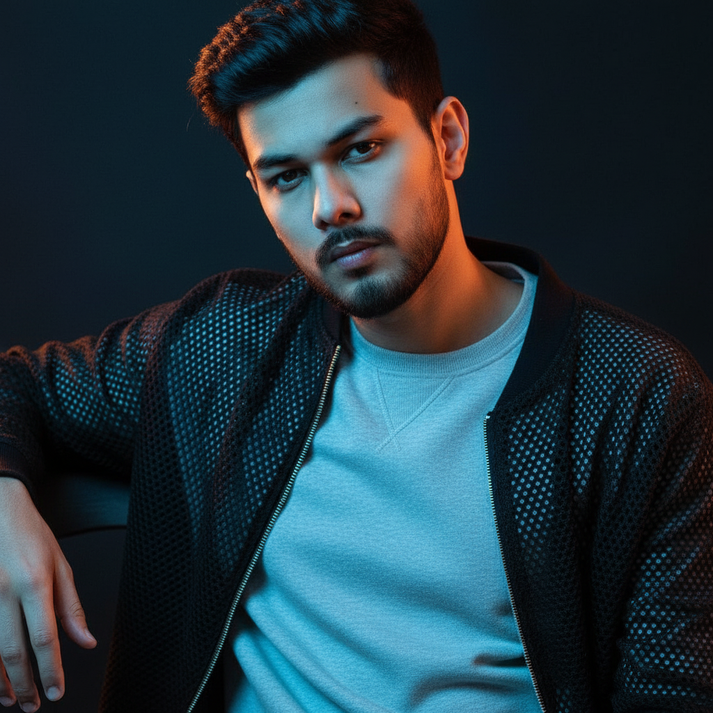 A stylish young man (Followed by given picture face 100% unchanged) Face and hair style use uploaded image , posing confidently with one arm resting on the back of a chair. He is wearing a light grey sweatshirt layered with a textured mesh-style dark jacket draped over his shoulders. The scene is lit with soft neon blue and orange lighting creating a cinematic and moody vibe. Dark background, high contrast, fashion editorial style, close-up portrait, soft shadows, dreamy aesthetic.
