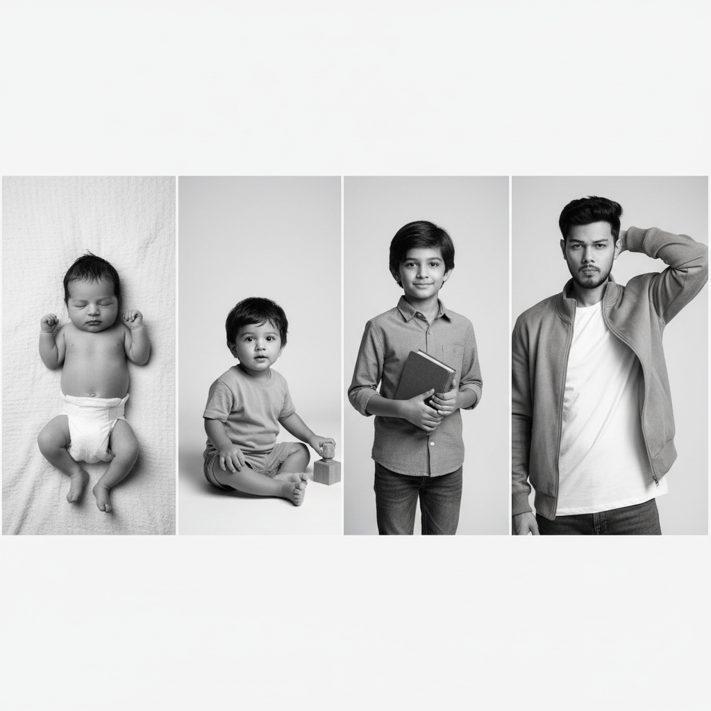 Here's an ultra-realistic black-and-white photo depicting the evolution of the subject [using the uploaded photo for 100% facial reference] from infancy to adulthood, arranged in a left-to-right progression. The composition features a clean, minimalist background with a subtle white-to-gray gradient, creating a timeless studio ambiance.