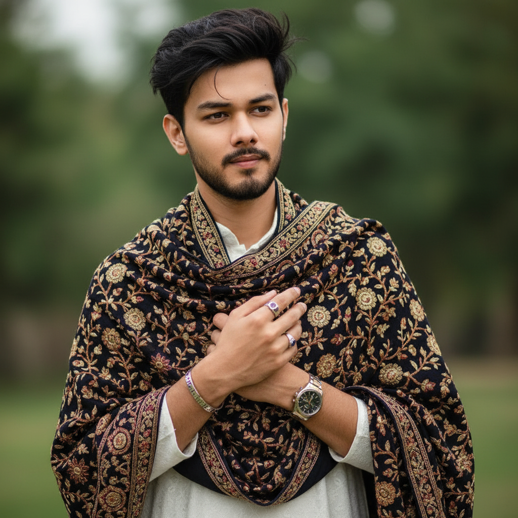 “Ultra-realistic close-up artistic portrait of a melancholic 20-year-old young man, height 5'8" (173 cm), weight 75 kg, standing against a green blurred background with creamy 35mm lens bokeh. He is wrapped in a dark patterned shawl with gold and maroon embroidery, wearing a white kurta-pajama, a luxury bracelet, two rings, and a luxury watch.