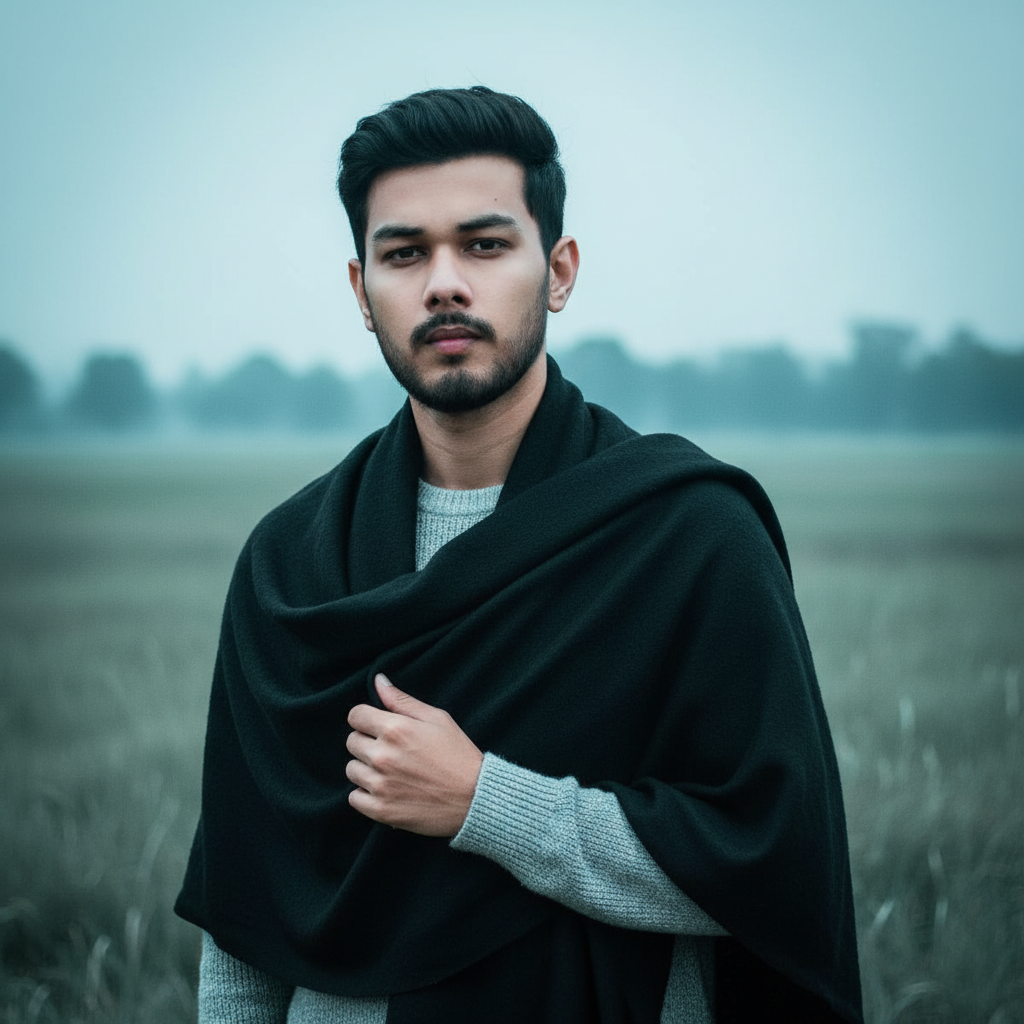“Ultra-realistic close-up portrait of the same young man (keep face exactly as the reference). Shot in a grassy field on a moody morning with no fog. Cinematic editorial look. He wears a black shawl draped over a light grey sweater, with part of the shawl held softly in one hand. Stylish and confident expression, calm face, natural skin texture, sharp eyes. Cool blue-green natural tones in the softly blurred background with gentle bokeh. DSLR 4K quality, shallow depth of field, pro-grade color grading, ultra-detailed hair and fabric texture, crisp lighting, high-contrast but natural vibe, photographic realism.”